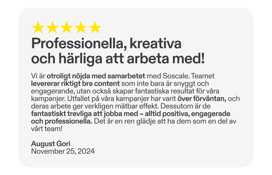 På SOSCALE är vi mer än bara en performance byrå – vi är ett kollektiv av strateger, kreatörer och tillväxtspecialister med ett gemensamt uppdrag: att skala varumärken smartare med hjälp av performancebaserat innehåll.